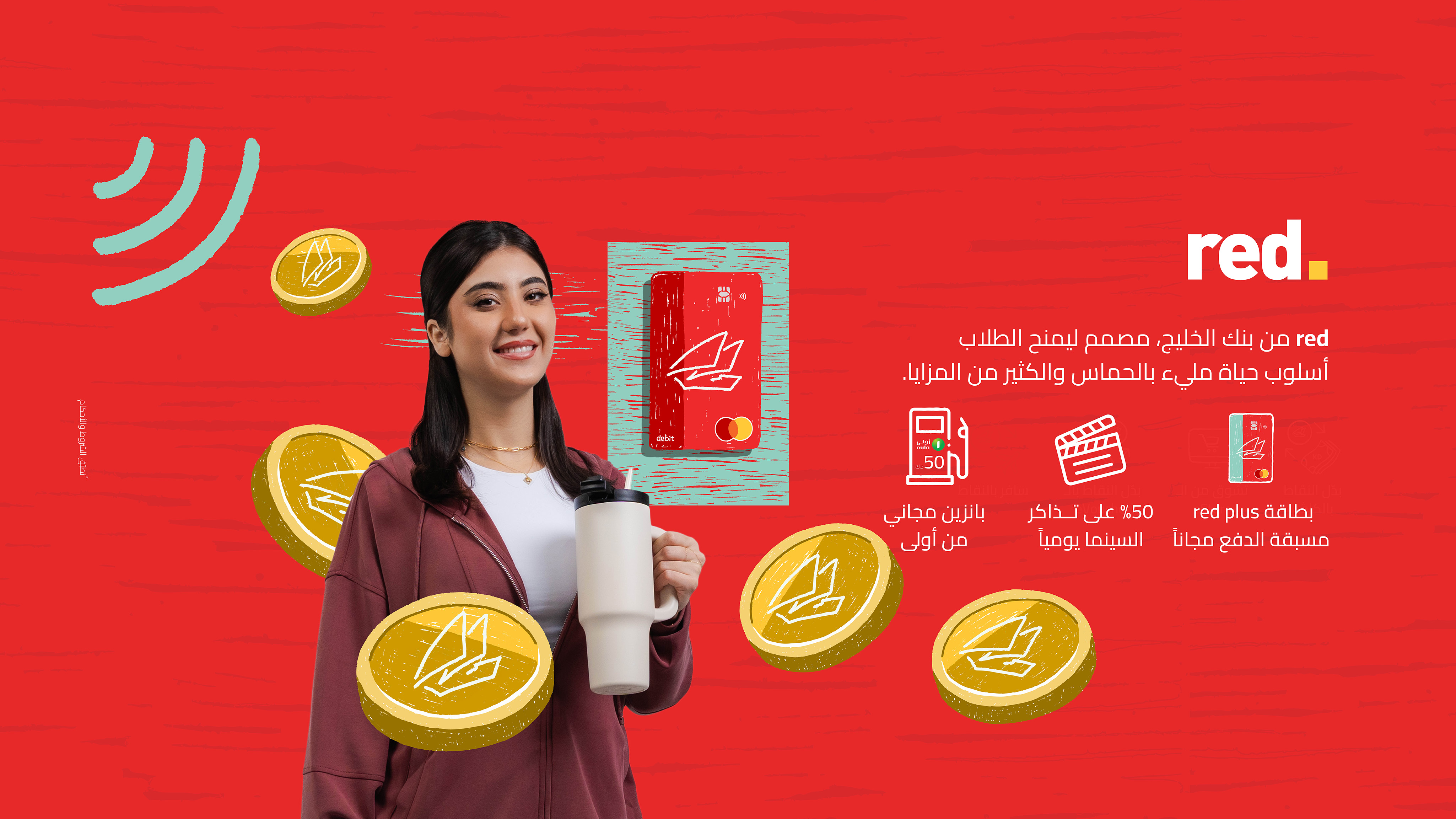 حساب .red من بنك الخليج هو شريكك في الدرب، يساعدك على التحكم في مصروفاتك وتحقيق أهدافك، ويشاركك لحظات السعادة والمتعة.