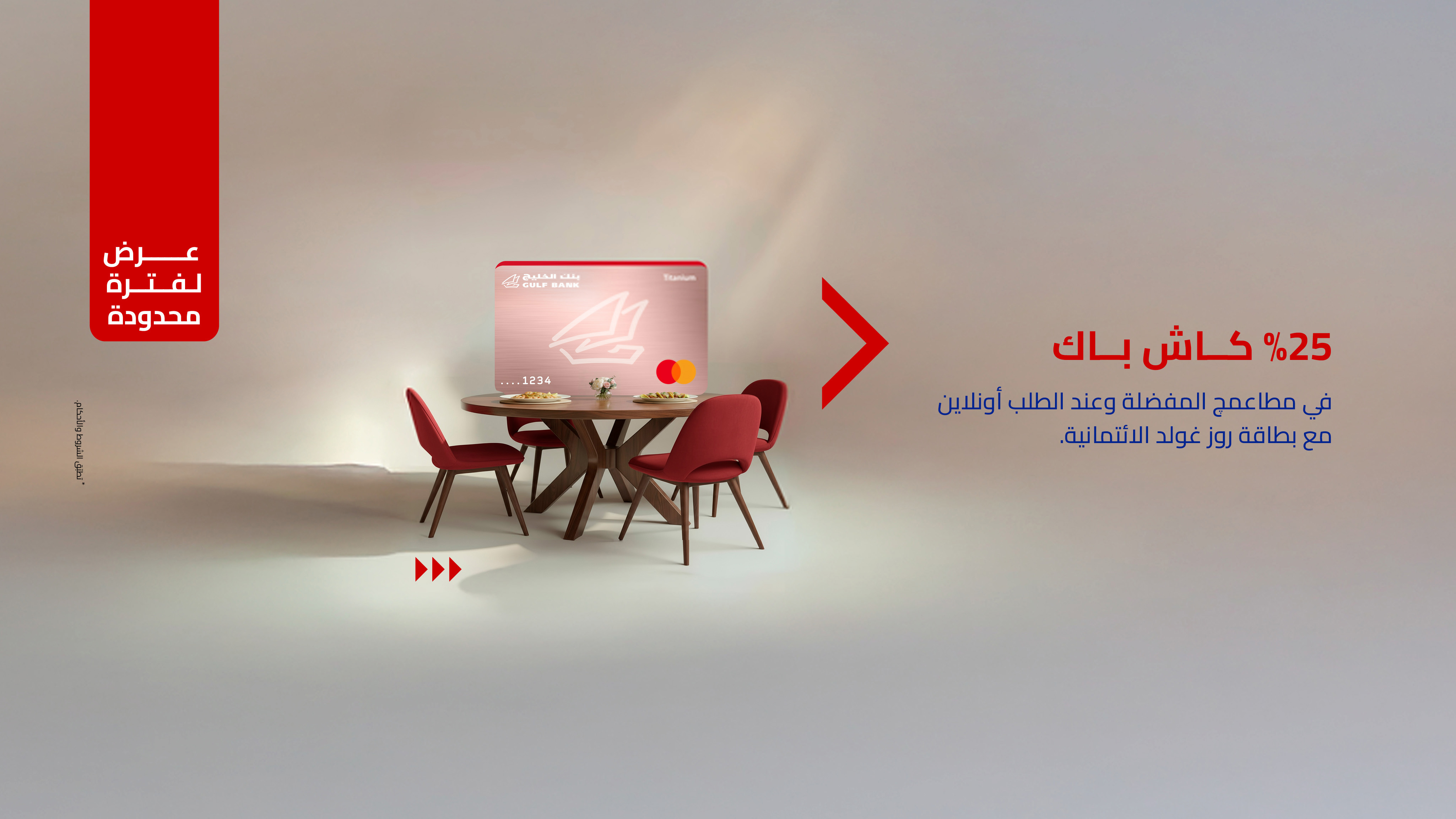 بإمكان حاملي بطاقات روز غولد الاستمتاع باسترداد نقدي حصري بنسبة 25٪ على جميع المطاعم والمقاهي داخل الكويت، بما في ذلك عند شراء الطعام والمشروبات من خلال التطبيقات الالكترونية عند الدفع باستخدام بطاقة روز غولد الائتمانية من بنك الخليج.
