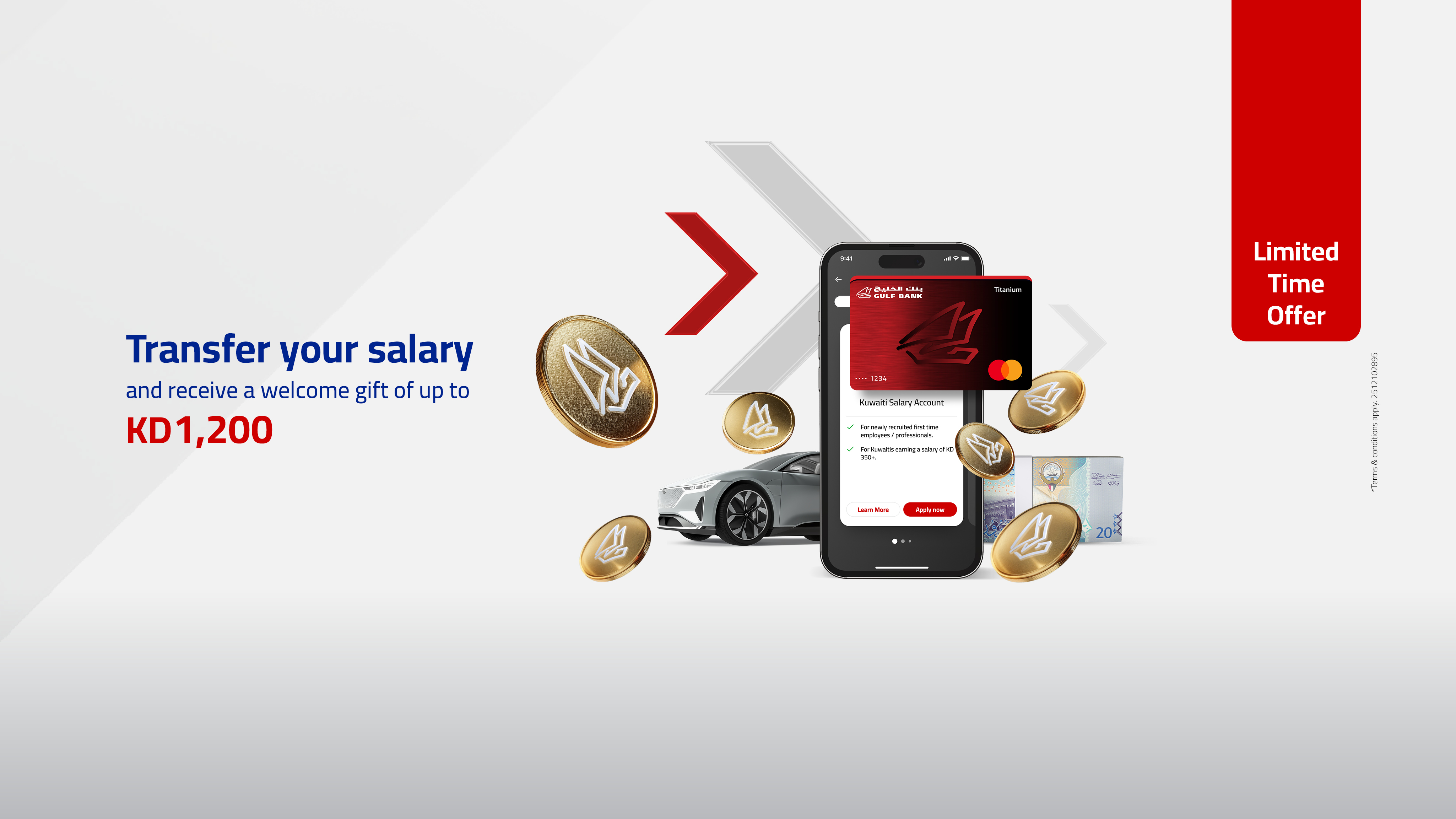 Starting your career is an exciting milestone and at Gulf Bank, we’re here to make it even more rewarding. With the Gulf Bank Salary Package, you’ll receive a generous welcome gift of up to KD 1,200 when you transfer your salary, giving you the perfect boost as you step into this new chapter of your life. Beyond the welcome gift, you’ll gain access to a wide range of credit cards carefully designed to suit different lifestyles and financial needs, each offering unique privileges and direct entry into our exceptional Gulf Points program. With Gulf Points, every purchase becomes more valuable, unlocking a world of rewards, from shopping to travel and beyond.
