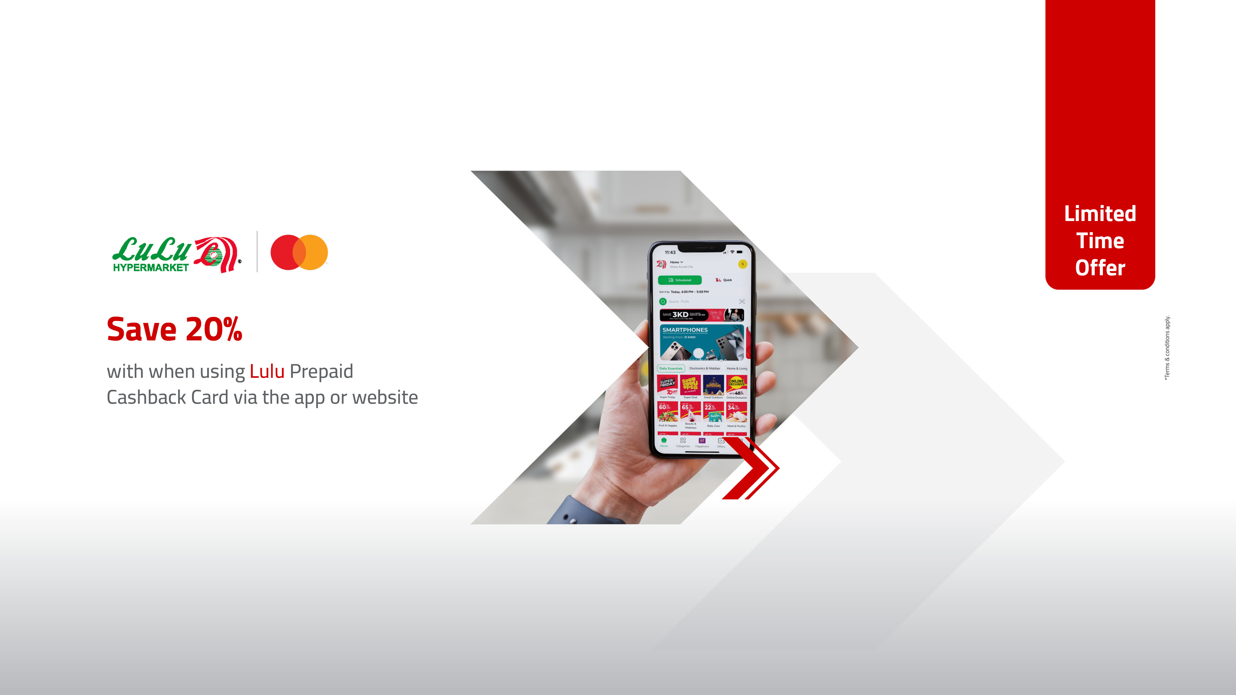 To celebrate our landmark partnership with LuLu Hypermarket, LuLu Prepaid Cashback Cardholders will unlock an additional 20% off when shopping on the LuLu website and App.