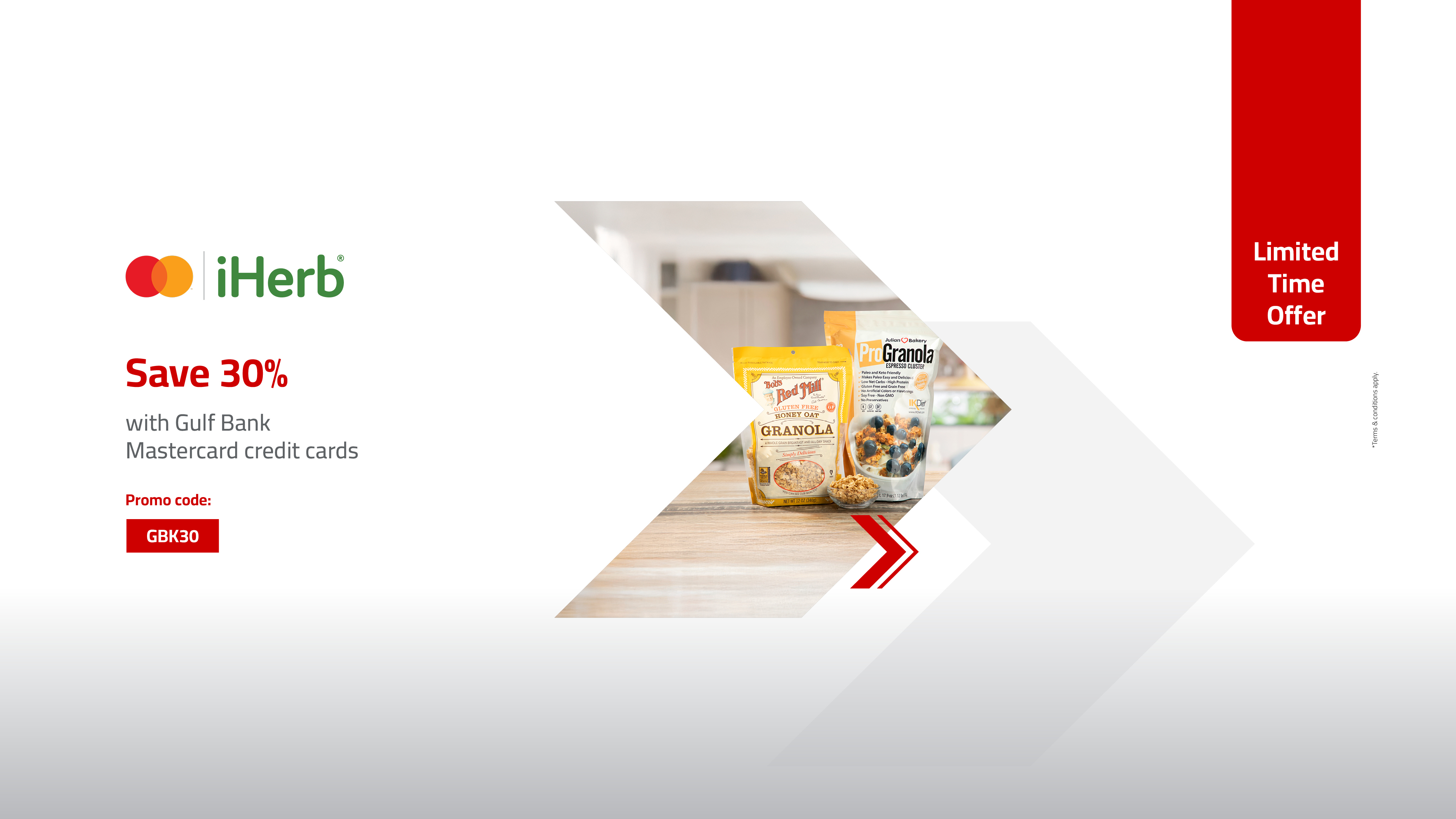 Enjoy exclusive 30% at iHerb App & website using your Gulf Bank Mastercard Credit Cards.