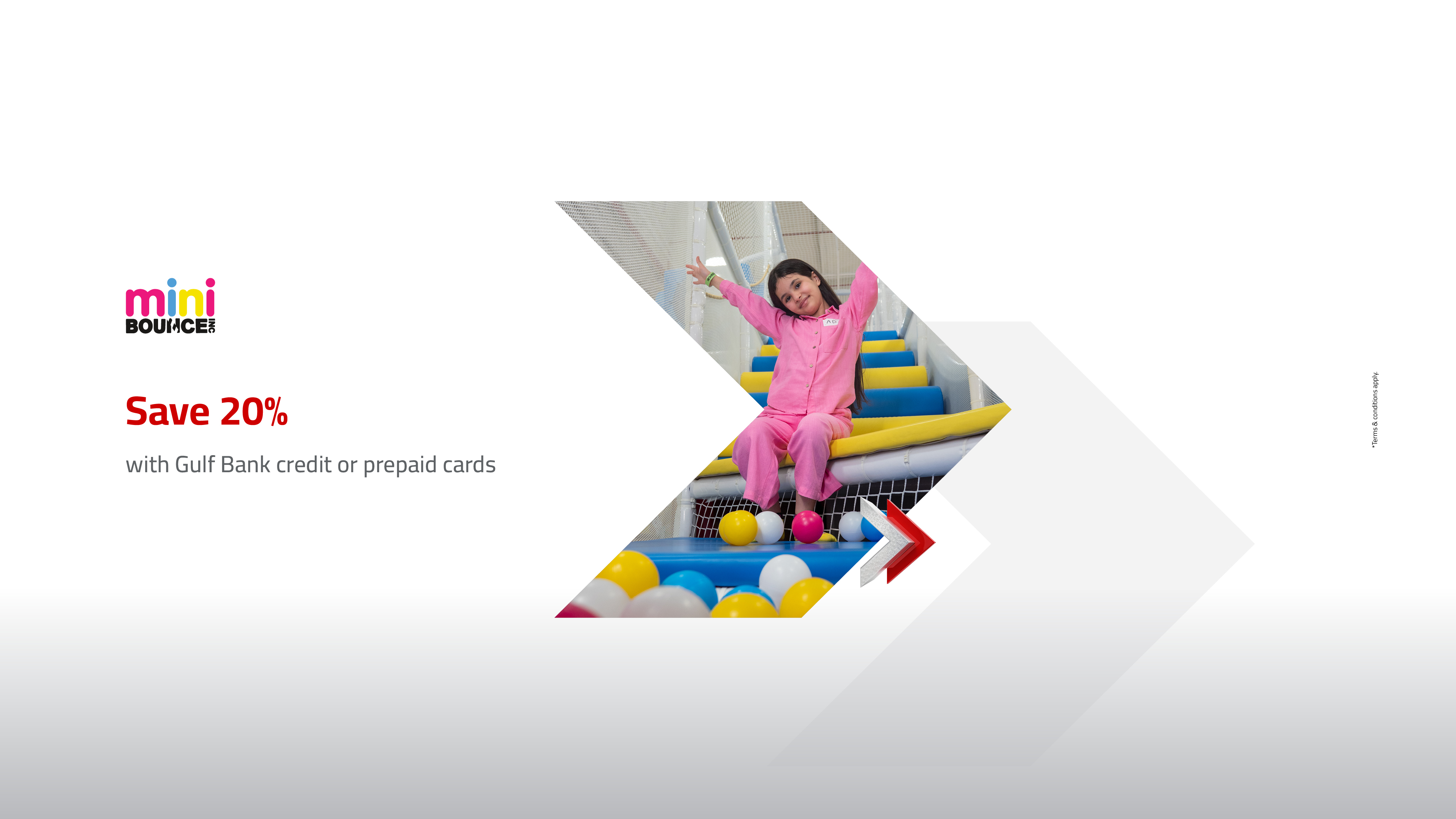Get a 20% discount at Mini Bounce when paying with your Gulf Bank Credit or Prepaid cards at participating branches in Kuwait only.