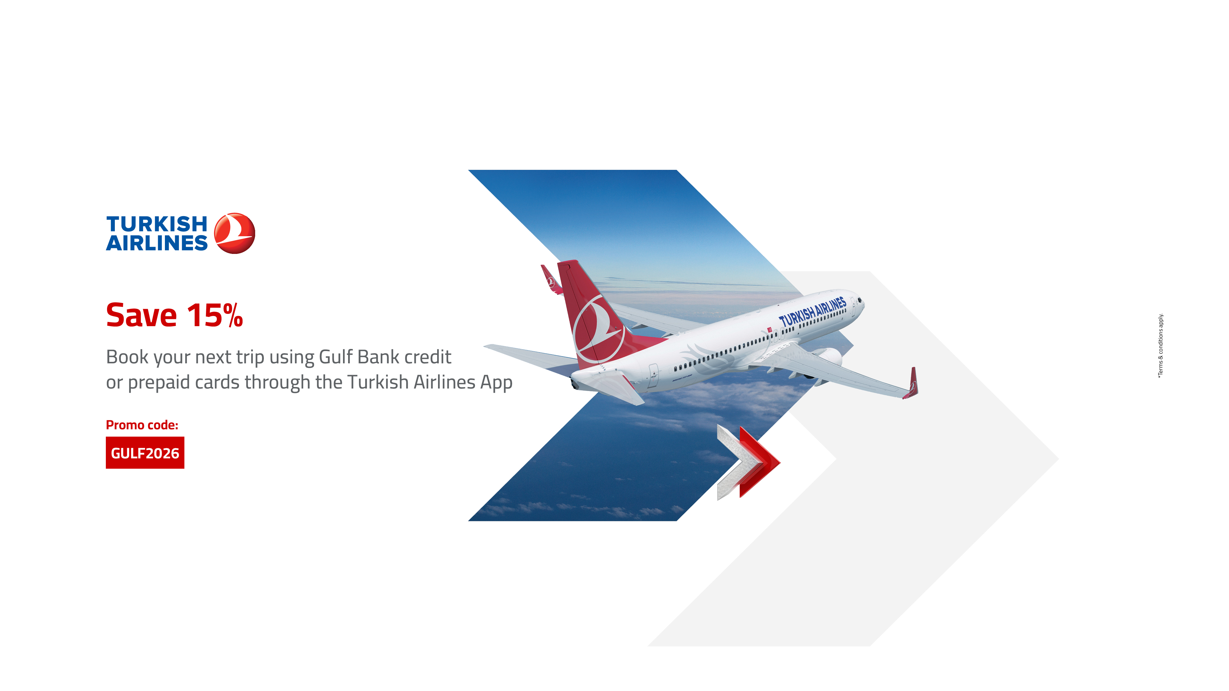 Get a 15% discount on Turkish Airlines flight bookings when paying with your Gulf Bank credit or prepaid card on the Turkish Airlines website and mobile application.